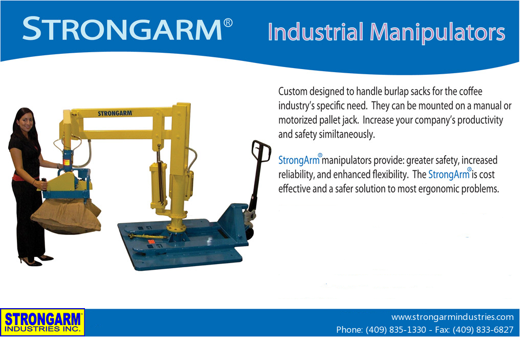 The Strongarm Industrial Manipulator is a low-cost solution for ergonomic lifting, material handling, enhancing safety, reducing fatigue and minimizing injuries while improving overall productivity.